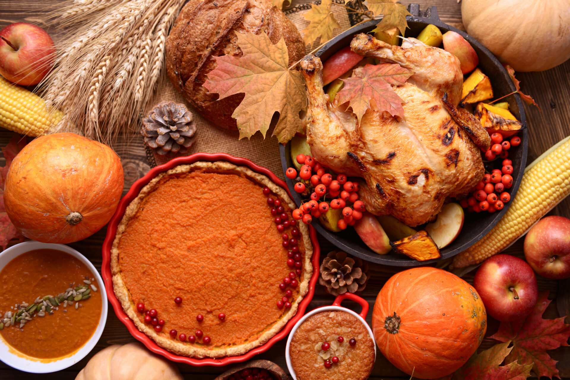 Traditional Thanksgiving still life. Roasted turkey, pumpkin pie, cranberries, autumn pumpkins and nuts on a dark wooden table. Top view. Holiday concept